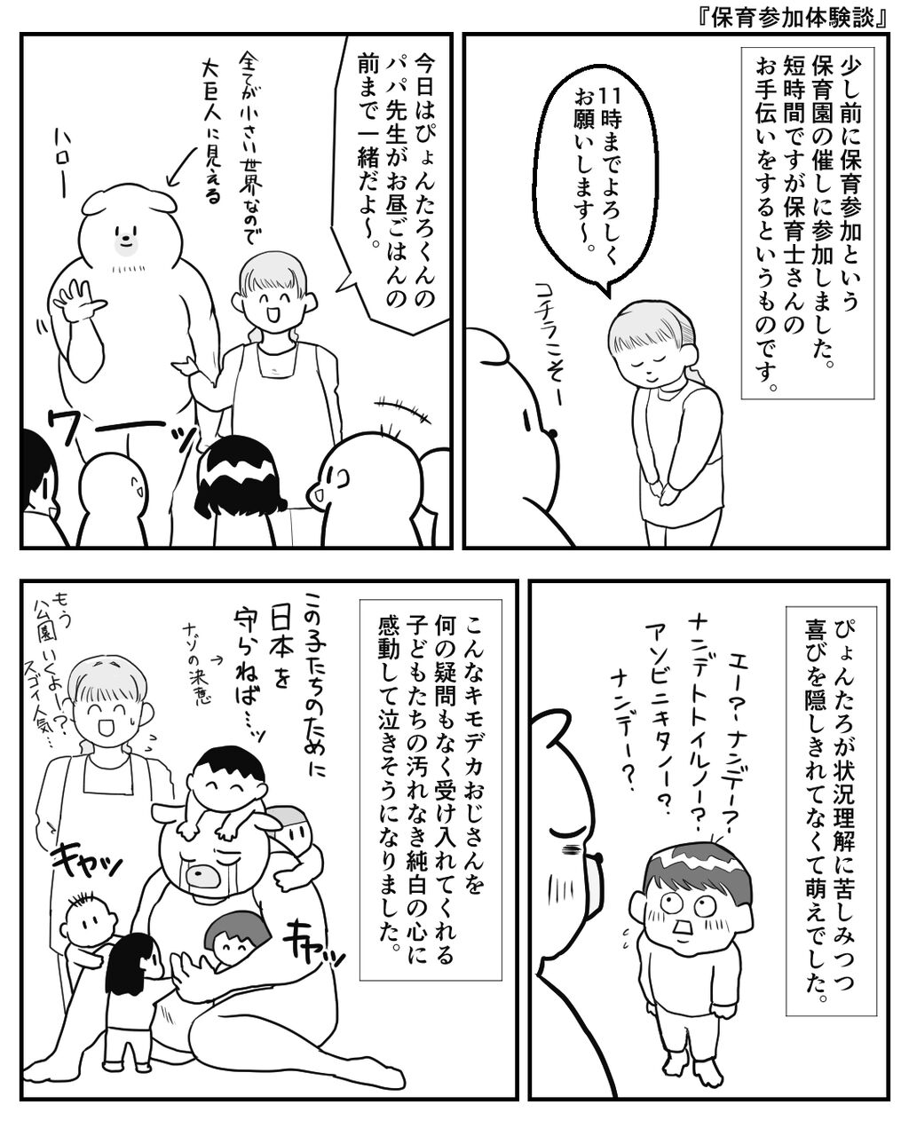 実際、保育参加は僕以外にもママさんが一人参加してて、別れ際はお子さんバク泣きだったんですが、ぴょんたろは割としれっとしてたんです。むしろ他の子たちがベッタベタで、なかなか剥がすのに苦労してました。