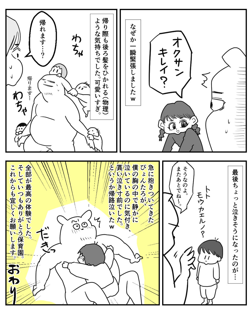 なんとか身支度出来て、じゃあ本当に帰りますよというタイミングで、ぴょんたろが半笑いみたいな不思議な表情で近寄って来たんです。でも抱き着く直前にくしゃって顔が崩れて、しくしく泣くもんだから、他の子たちの手前、色々我慢してたのかなとか想像しちゃって、ヤバかったです。ずるい。